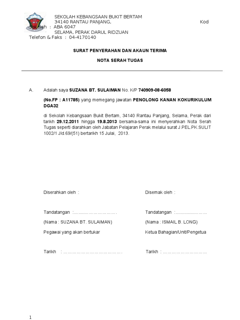 / Surat Serahan Tugas ~ Borang Nota Serah Tugas Untuk Pertukaran 1 Docx Lampiran A Format Nota Serah Tugas Kandungan Perkara Muka Surat 1 Surat Penyerahan Dan Akuan Terima Course Hero